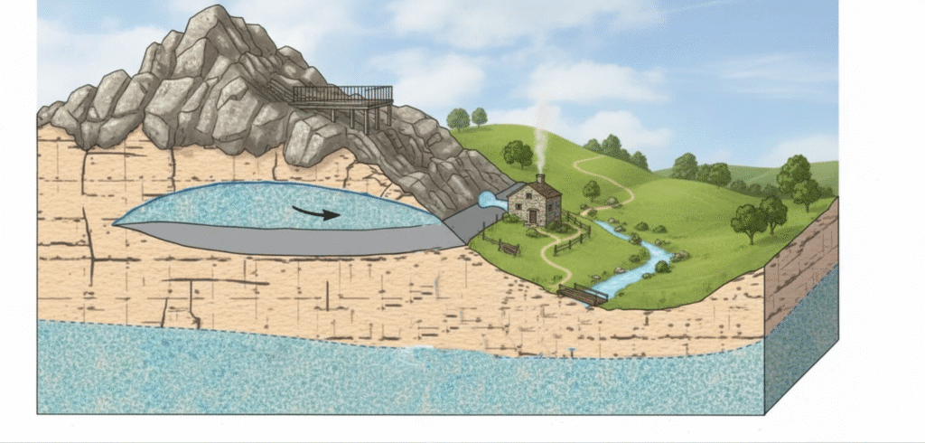 - Tutuklu akiferdeki su, basınç altındadır. Tektonik kökenli kırıklar veya fay düzlemleri bu basınçlı suya bir “yol” açtığında, su bu hatlar boyunca yukarı doğru yükselir.