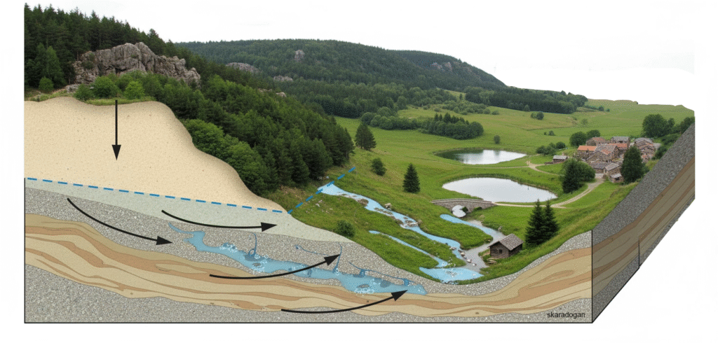 - Serbest akifer: Ana yer altı suyu; su tablası yüzeyle kesişince kaynak verir. Genellikle yamaçlarda görülür.