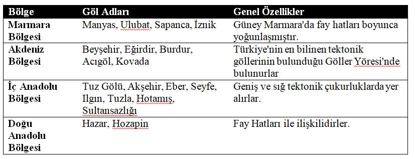 Tektonik göller, yer kabuğundaki düşey hareketler (faylanma, çökme) sonucu oluşan geniş çöküntü alanlarının (depresyonlar, grabenler) zamanla sularla dolmasıyla meydana gelir. Türkiye’nin aktif bir fay ağına sahip olması, bu tür göllerin oluşumu için uygun koşulları sağlamıştır. Ülkemizdeki başlıca tektonik göller, fay hatları boyunca belirli bölgelerde yoğunlaşmıştır.