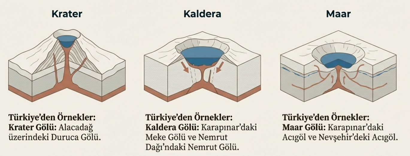 - Maar Gölleri: Magmanın yeraltı suyuyla temas etmesi sonucu oluşan şiddetli gaz patlamalarının açtığı çukurluklarda oluşurlar. Konya-Karapınar’daki Acıgöl ve Nevşehir’deki Acıgöl bu türün örnekleridir.