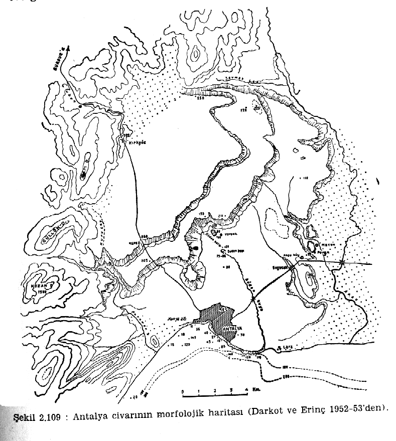 Antalya çevresindeki travertenleri gösteren jeomorfoloji haritası (Darkot ve Erinç 1952-53’den)