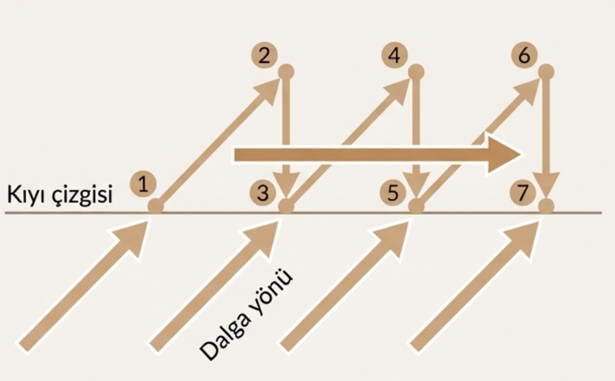 Dalga hareket yolunun kıyı çizgisine dik olduğu durumda, plaj yüzeyinde ilerleyen ve geri çekilen sular unsurların da ileri geri hareket etmelerine neden olur.