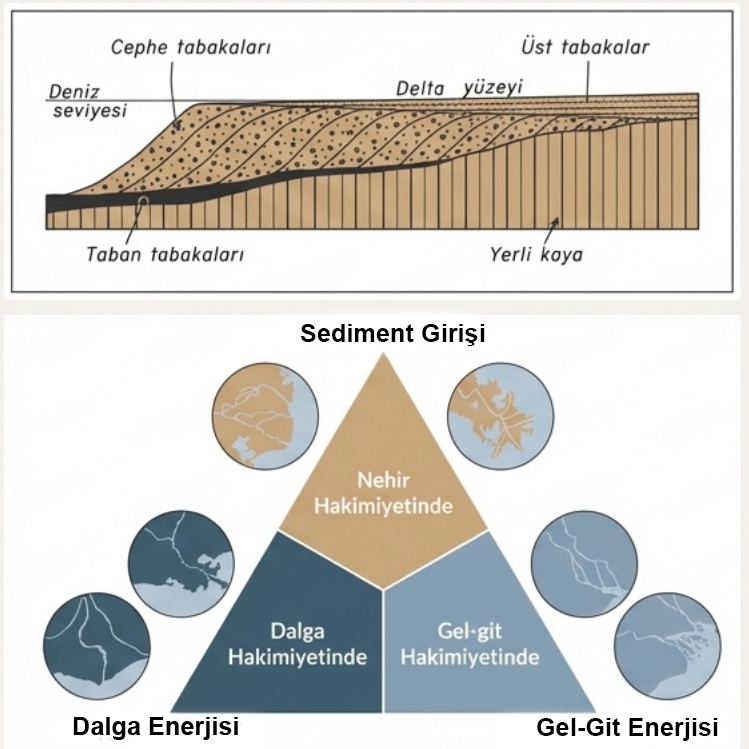 Kıyıya sonradan eklenmiş biriktirme şekillerinden olan deltalar, akarsular tarafından kıyıya bol miktarda alüvyon getirilip orada biriktirilmesinin yanısıra, oluşum, gelişim ve şekillenmelerinde dalgalar ve kıyı akıntılarının da rol oynadığı şekillerdir. Akarsuların okyanus veya denizlere döküldükleri ağız kısımlarında meydana gelirler ve basit şekliyle denize doğru delta veya üçgen şeklinde çıkıntı yapan birikim şekilleridir.Deltaların oluşumu için akarsular tarafından bol miktarda malzeme getirilmesi , kıyıların sığ olması ve kıyı akıntılarının fazla etkili olmaması gerekir. Deltalar gelişirken alüvyonlar ileri ve yanlara doğru yayılarak yükselir ve su yüzeyine çıkarlar. Bu oluşum esnasında farklı üç tabaka grubu meydana gelir ; 1- Taban tabakaları, 2- Cephe tabakaları, 3- Üst tabakalardır. Deltalara örnek olarak ülkemizdeki Kızılırmak (Bafra), Yeşilırmak (Çarşamba), Gediz, Büyük Menderes, Göksu, Seyhan-Ceyhan (Çukurova) deltaları ile Nil (Mısır), Mississipi (A.B.D.), Po (İtalya), Tuna (Romanya), Volga (Rusya) deltaları verilebilir.