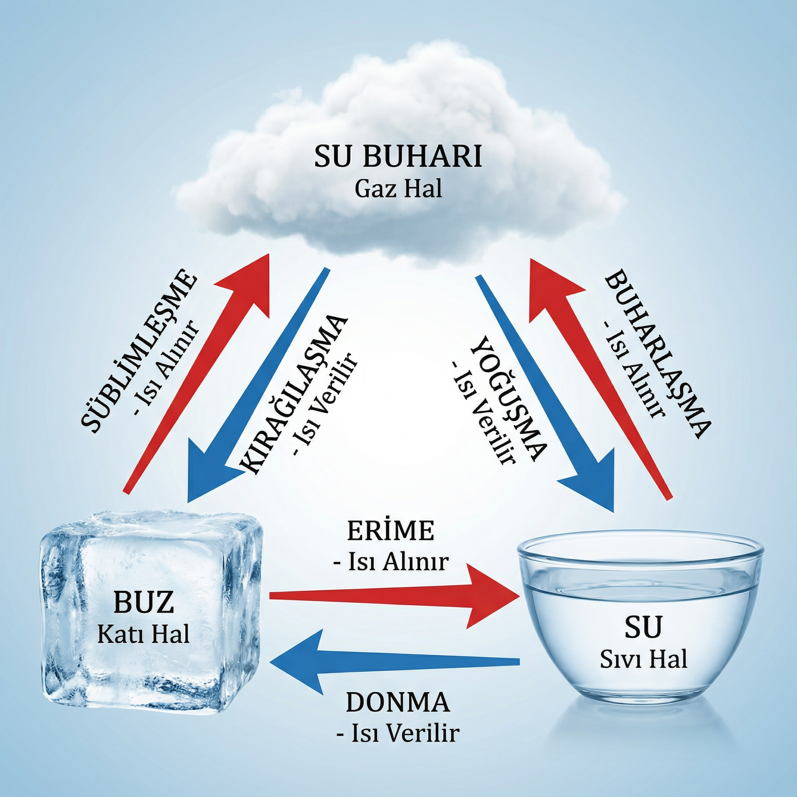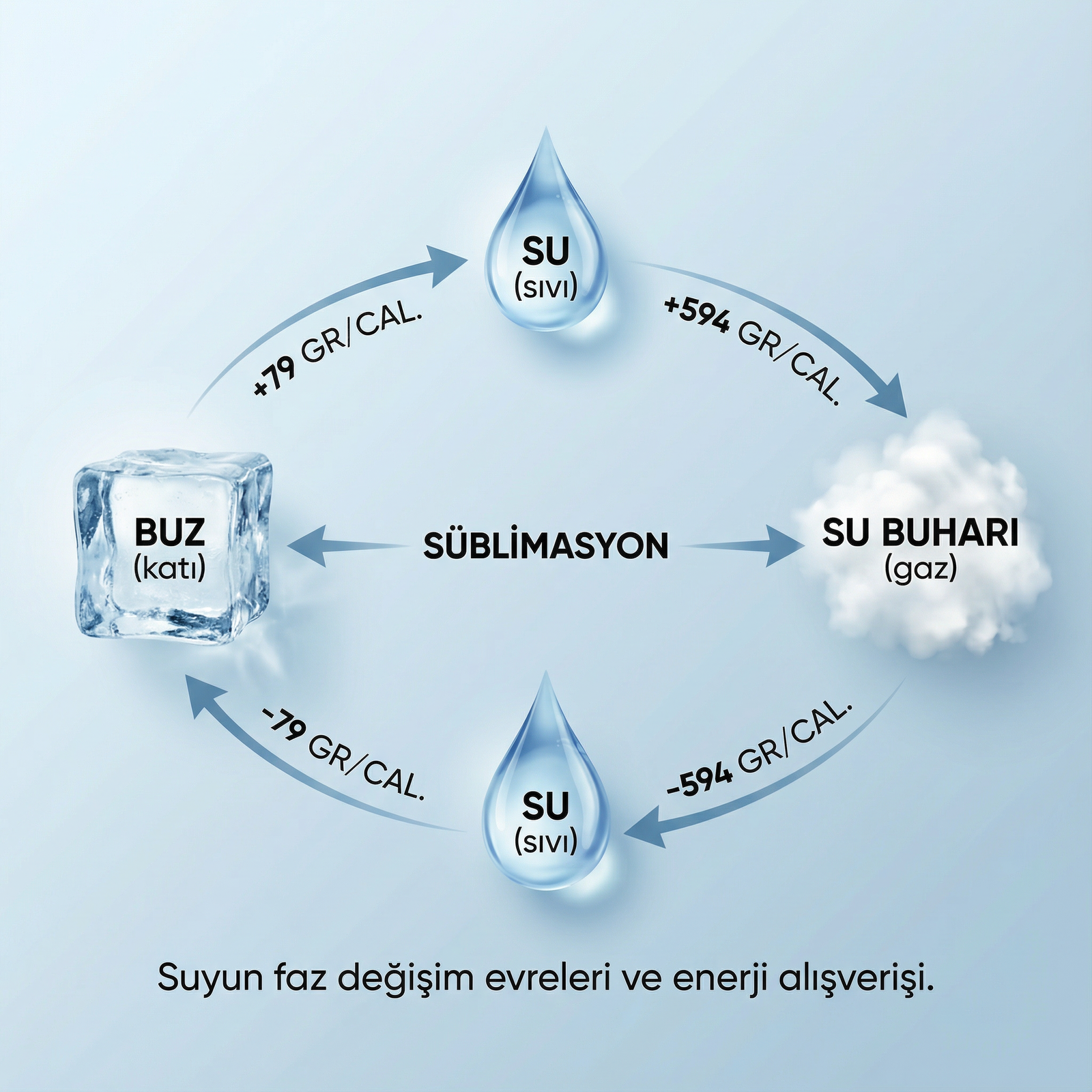 Suyun katı halden direk gaz haline geçmesine veya gaz halinden direk katı hale geçmesine süblimasyon denir.