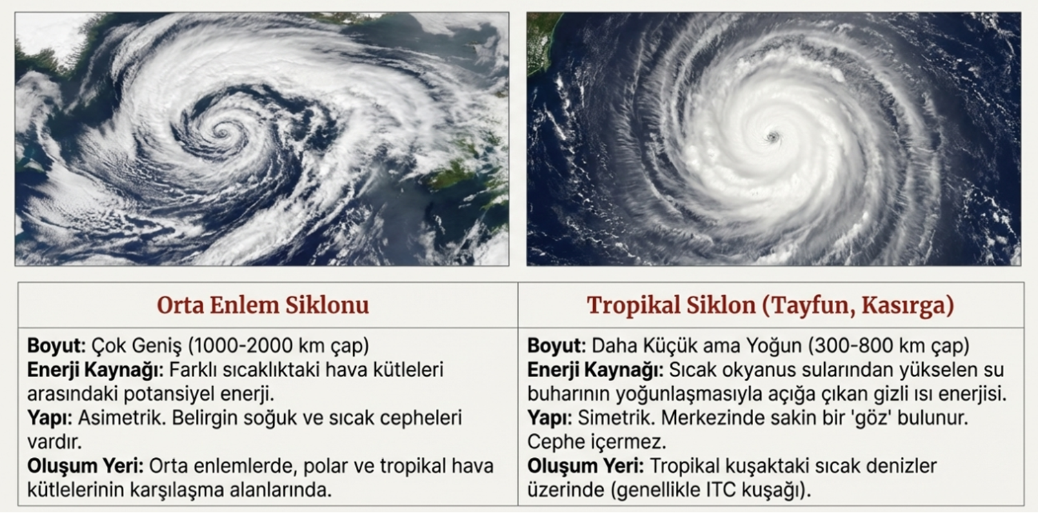 Orta enlem siklonlarına göre daha küçük yerel özellikli olmalarına rağmen tropikal siklonlar, çok şiddetli ve güçlü atmosfer olaylarını doğururlar. Başta Amerika kıtasında Tayfun ve Kasırga olarak sel ve benzeri afetlere yol açıp tarım arazilerini tahrip ederler.