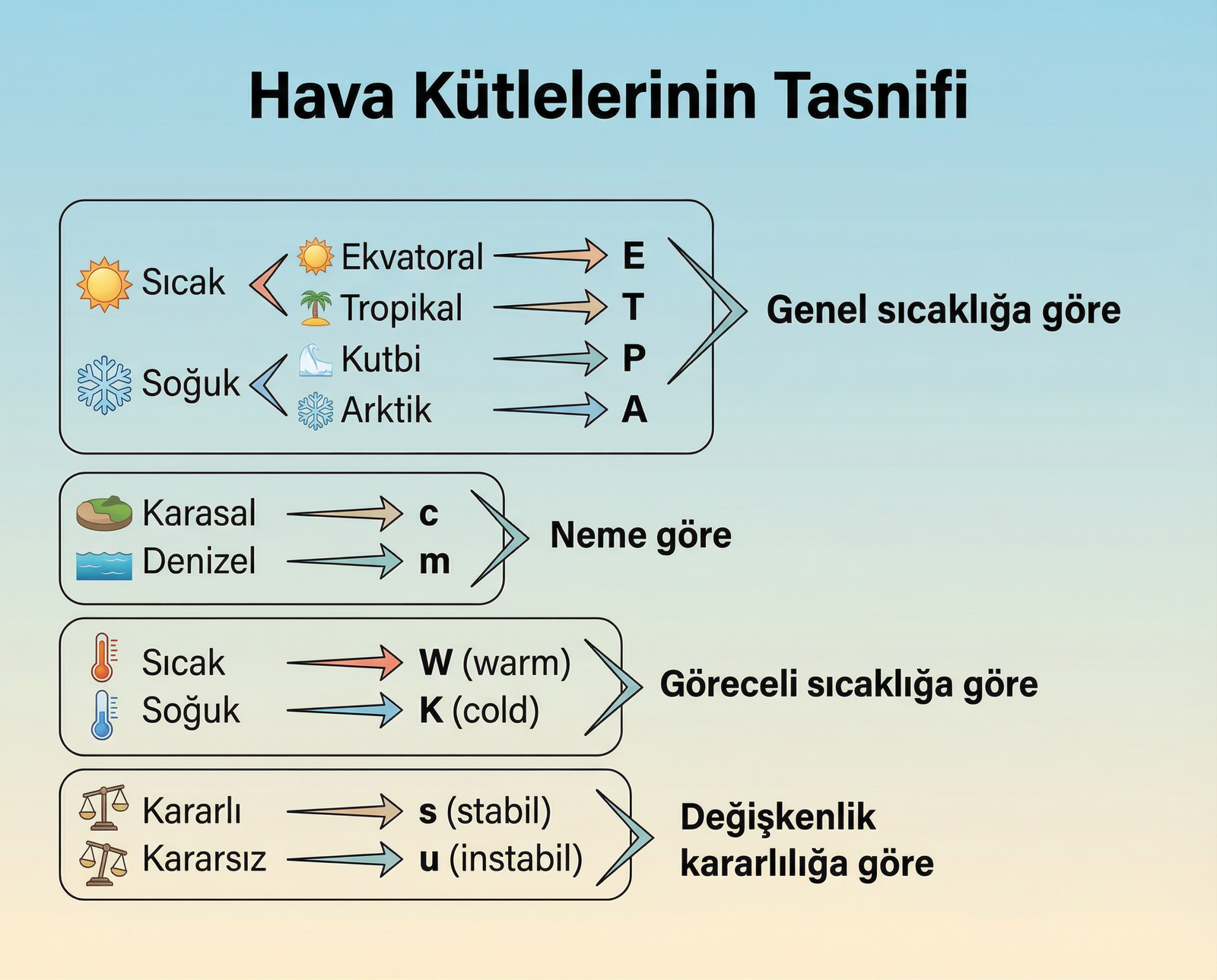 • Sıcak → W (warm): Hava kütlesi, geçtiği zeminden daha sıcak (alttan ısınır, kararsızlaşır, yükselme ve yağış eğilimi artar)