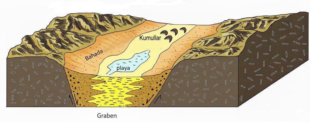 Akarsu Etkisi: Kurak ve yarıkurak bölgelerde akarsu etkisi, sınırlı su kaynakları ve bitki örtüsünün zayıflığı nedeniyle oldukça özgün bir nitelik kazanır. Bu ortamlarda yağışlar genellikle epizodik ve sağanak karakterli olduğundan, bitki örtüsünün yetersizliği toprağı korumasız bırakır. Sonuç olarak, şiddetli yağışlar hızlı bir şekilde sel ve seyelana (yayvan akış veya sheet flood) olaylarına dönüşür. Bu akışlar, özellikle çöllerde kısa süreli ve yoğun olur, akarsulardan ziyade sellerin hakimiyeti altında şekillenir. Oluşan sular, “bolson” olarak adlandırılan kapalı havzaların tabanlarında birikerek “playa” adı verilen geçici göller veya su birikintileri yaratır. Bu playalar, genellikle tuzlu ve çamurlu tabanlara sahip olup, kuruduklarında sertleşmiş yüzeyler bırakır.