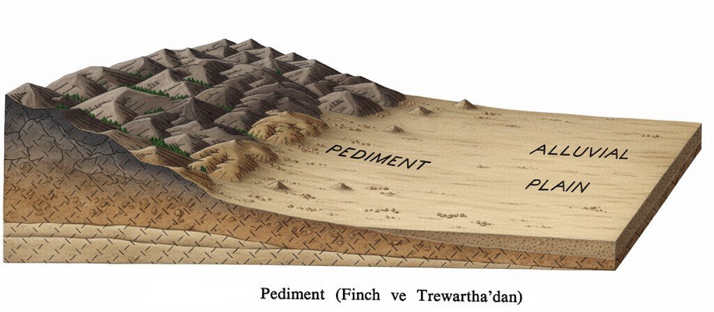 - Topoğrafya Şekillerine Göre: Kurak bölgelerde topoğrafya monoton ve az engebeli olup, aşındırma ön planda kalkan/platform çölleri ile dağ eteklerinde birikim etkili engebeli çöller görülür. Yarıkurak bölgelerde ise pediment, playa ve bahada gibi şekillerle sel karakterli akarsular etkilidir.