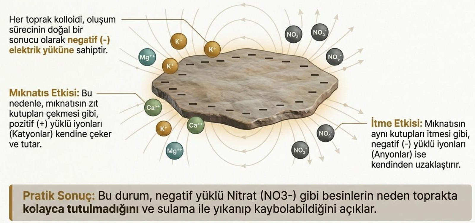 Kolloidler, oluşum sürecinde negatif (-) yüklüdür. Bu, mıknatıs etkisi yaratır: Pozitif yüklü katyonları (K⁺, Ca²⁺, Mg²⁺, H⁺, Na⁺) çeker ve tutar; negatif yüklü anyonları (NO₃⁻, SO₄²⁻) iter. Bu nedenle, nitrat gibi anyonlar yağışla kolayca yıkanır.