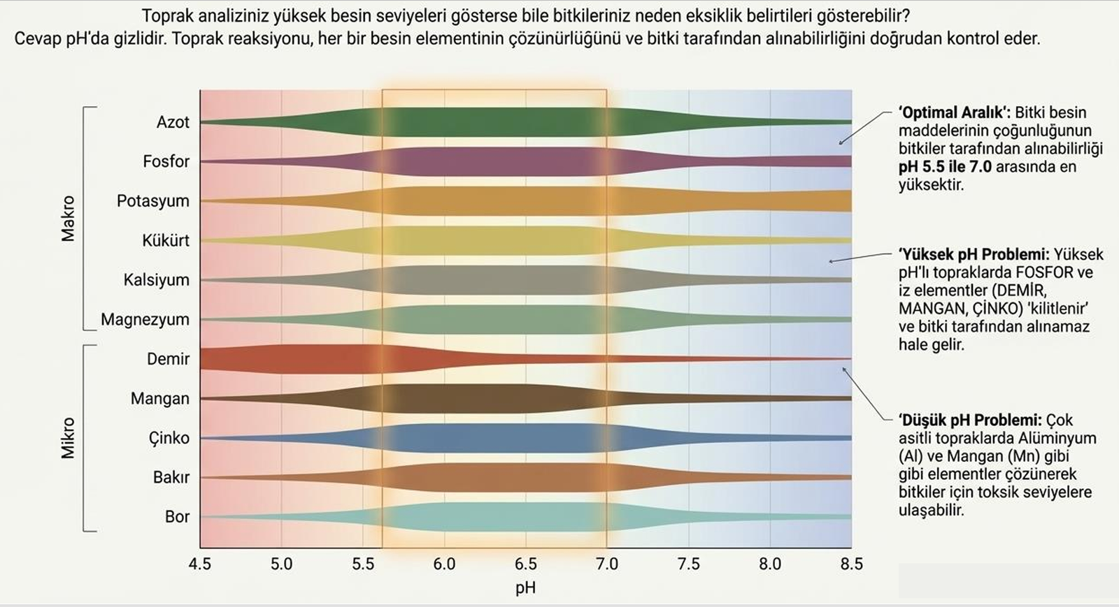 - Bitki besin alımı: En verimli aralık 5.5-7.0. Yüksek pH, fosfor ve iz elementleri (Fe, Mn, Zn) bağlar; düşük pH, kök alımını engeller.
