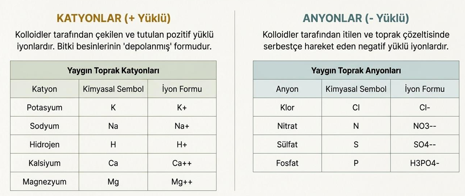 Elektrik yüklü elementlere “iyon” denir. Toprak kimyasında bu iyonlariki ana gruba ayrılır ve bitki beslenmesinde kritik rol oynarlar.