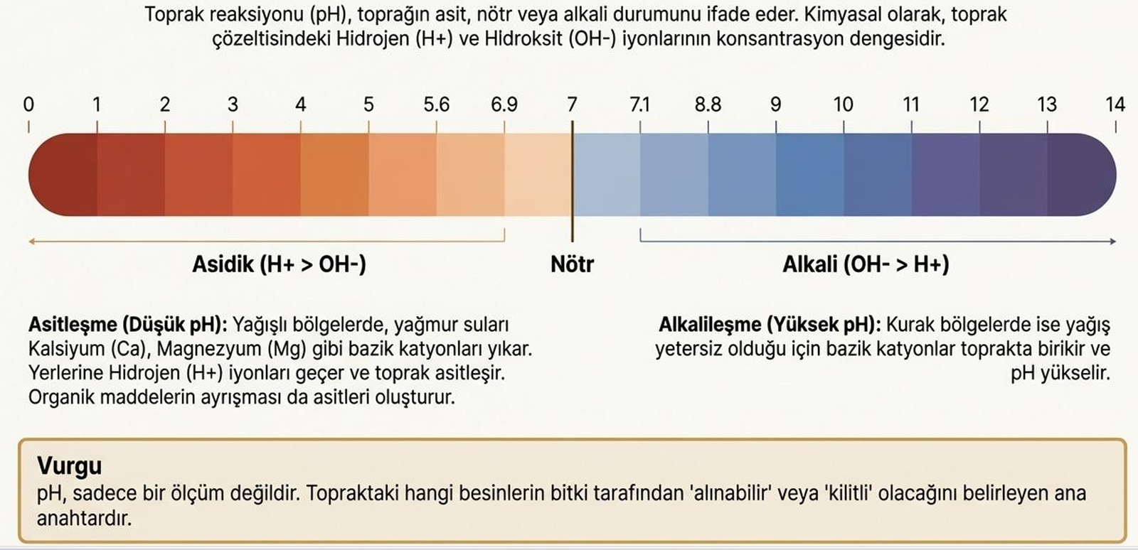 Toprak pH’sı, su çözeltisindeki H⁺ ve OH⁻ iyonlarının konsantrasyonunu gösterir (negatif logaritma). Değer aralığı 0-14’tür: 7 nötr, <7 asit, >7 alkali.
