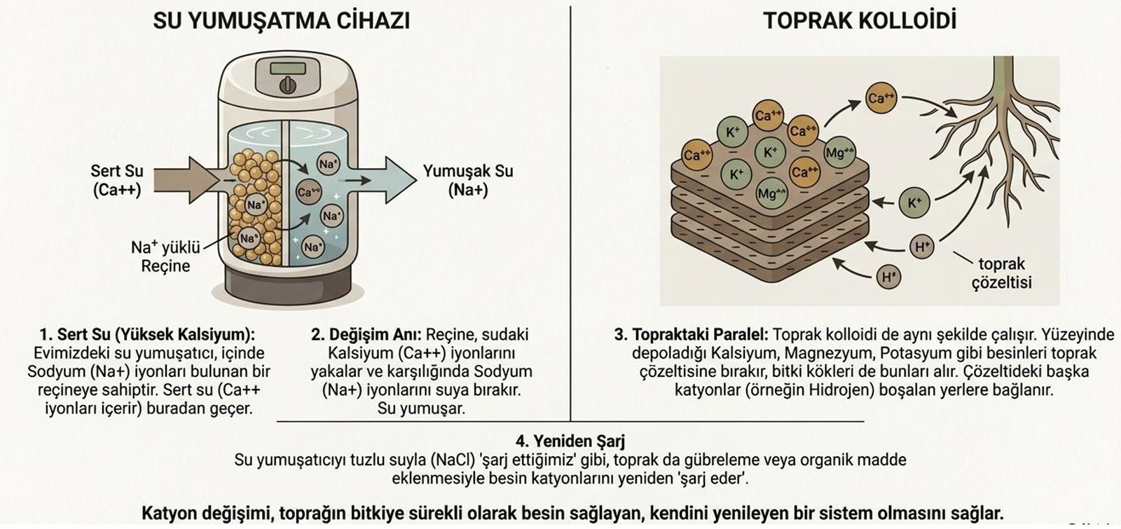 İyon değişimi, besin maddelerinin bitkilere ulaşmasını sağlar. Asit topraklarda H⁺ ve Al³⁺ baskındır; alkali topraklarda Ca²⁺ ve Mg²⁺.
