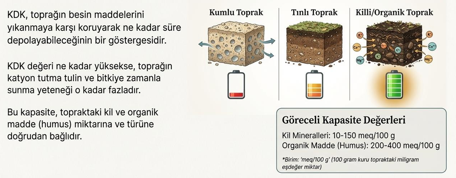 KDK, toprağın tutabileceği değiştirilebilir katyonların toplam miktarıdır. Negatif yük miktarını gösterir. Yüksek KDK, yüksek kil ve organik madde oranıyla ilişkilidir (killi topraklar > kumlu topraklar). KDK, toprak verimliliği ve pH düzeltmesinde rol oynar.